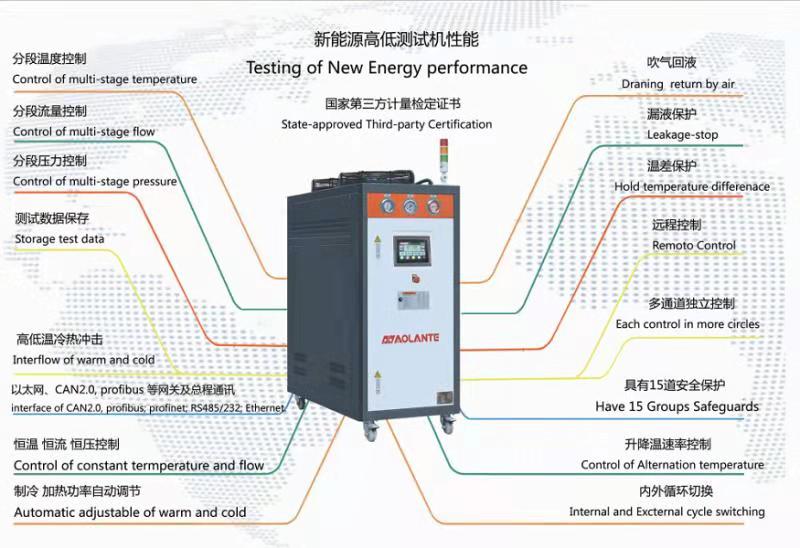 深圳奧蘭特機(jī)械開發(fā)的新能源汽車動(dòng)力電池液冷測(cè)試系統(tǒng)、動(dòng)力電池包深度冷熱沖擊試驗(yàn)機(jī)溫度控制范圍-60~110℃,流量2-100L/min,壓力恒定0~400Kpa;控溫精度:±0.1℃,壓力控制精度±0.1L??刂凭榷加蓢H第三方檢測(cè)機(jī)構(gòu)出具證書。
